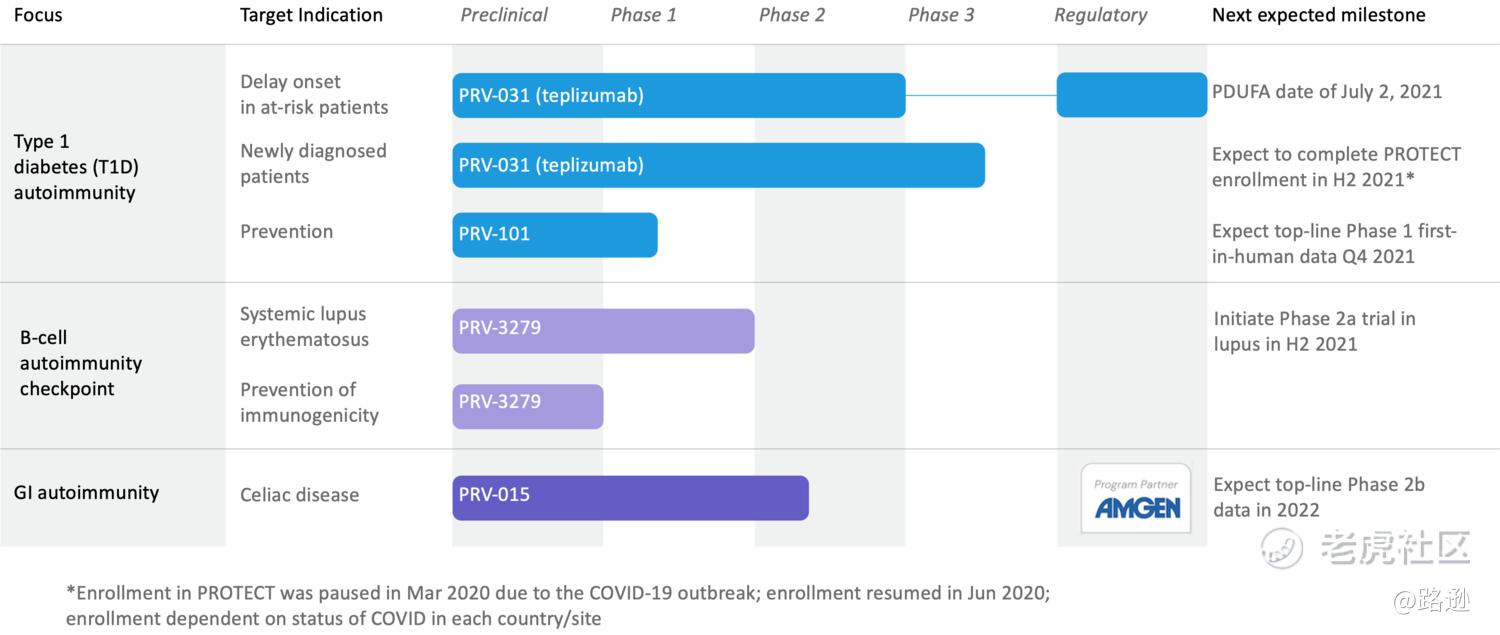 首先看管线。Focus是自身免疫性疾病,具体是T1DM、B细胞、消化道3个领域的自身免疫性疾病。产品是PRV-031(又称teplizumab)、PRV-101、PRV-3279、PRV-015。PRV-031针对T1DM,有At-risk研究(延缓高危病例发病)和PROTECT研究(治疗已发病人群)两个试验。At-risk研究在完成P2后向FDA提交了上市申请,PDUFA日期定在2021年7月2日。PROTECT研究在P3入组状态,2020年因COVID暂缓入组3个月。PRV-101也针对T1DM,是一种疫苗,在P1状态。PRV-3279针对系统性红斑狼疮,在P1状态。PRV-015针对Celiac disease,即乳糜泻。近期的股价变化主要是集中在PRV-031的研究变化和FDA回应。本文集中在PRV-031的综述。