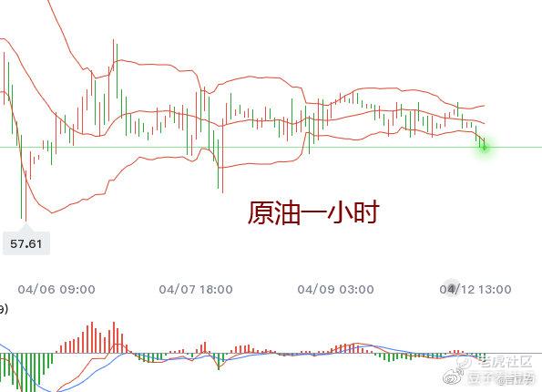 图为原油一小时级别。做了交易的都知道震荡了多久,但是马上走出来了不是吗?目前虽然macd动能不足,但布林带开口发散,k线沿着下轨方向运行,现价58.8,之前挂的空单终于有机会了,短空的朋友可以第一看58.4,重点关注的是57.3(上周说明了,可以去回顾),破57.3的话,起码还有四美元的下跌空间。