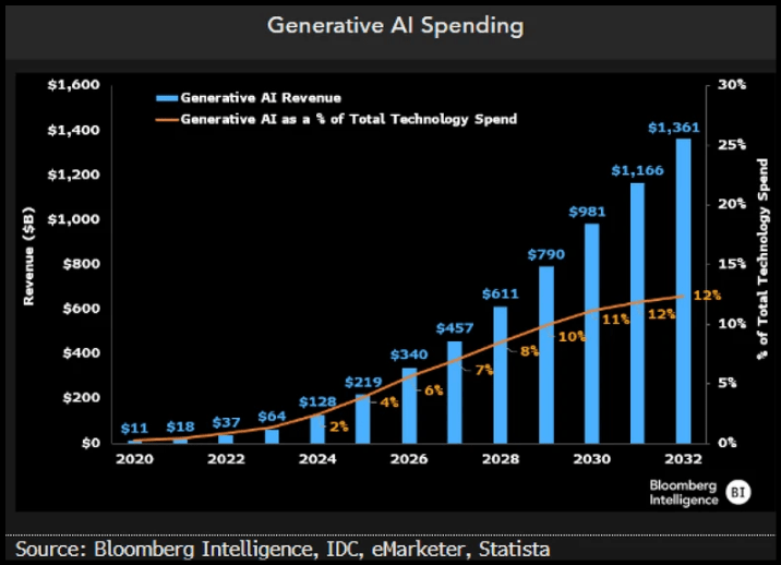 在经济不确定的情况下,坚持不懈的是对人工智能持久繁荣的信心,而这种信心背后是爆炸性增长预测。根据IDC 的最新研究报告,到 2028 年,全球人工智能支出预计将以近 30% 的复合年增长率增长至 6320 亿美元,这主要得益于人工智能软件应用、基础设施、硬件和相关 IT 服务。根据彭博社汇编的数据,到 2032 年,随着广告和游戏等细分市场需求的增长,生成性人工智能支出可能超过 1.36 万亿美元。