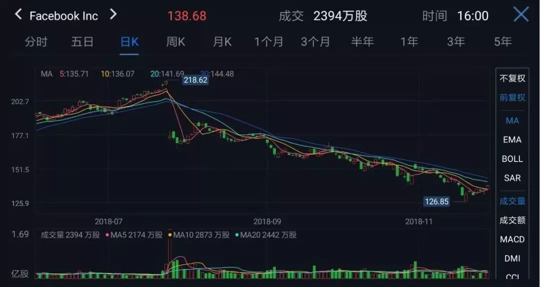 前有亚马逊10月下跌20%,后有谷歌母公司Alphabet从7月高位至今跌出逾200点,这些都还只是前菜。最近,作为美国五大互联网巨头之一的Facebook,其股价从7月25日至今已累计下跌了近40%,市值蒸发了近2000亿美元。港股市场的“仙股”腾讯也从475.72港元最低到过251.4港元。