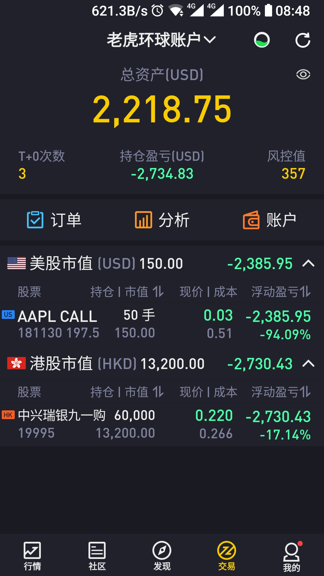 港美期权一定要在大盘和个股行情多空趋势极度明显时介入,极高确定性加重仓一次。每周最多操作二次,没有操作性的盘不要浪费精力去看盘。熊市多做空,牛市多做多。美股做财报及利空黑天鹅反向日内期权快速低仓位高杠杆操作,港股多正股大盘多头做新高,空头做新低。 经验教训: 1平行仓位顺加逆减,严禁逆势加仓。 2不做末日期权和高虚值期权,设好止损坚决执行。 3不做流动性不好或者没有沽空的期权。