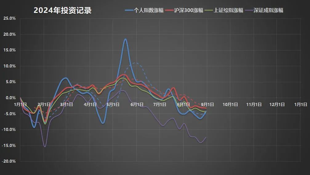 截至8月收盘,我的收益率-4.2%,沪深300也转跌到-3.2%,上证的-4.5%,深证-12.3%。我这个月并没有变得更好,但大盘指数们显然都在变得更糟。