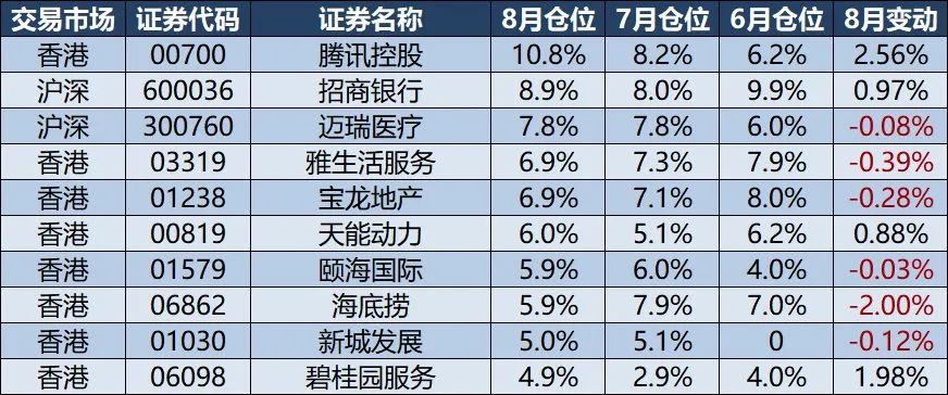 8月主要增持:荣晟环保、腾讯控股、碧桂园服务、雅居乐集团、招商银行A、天能动力、新华保险H、标普500ETF、日经ETF。