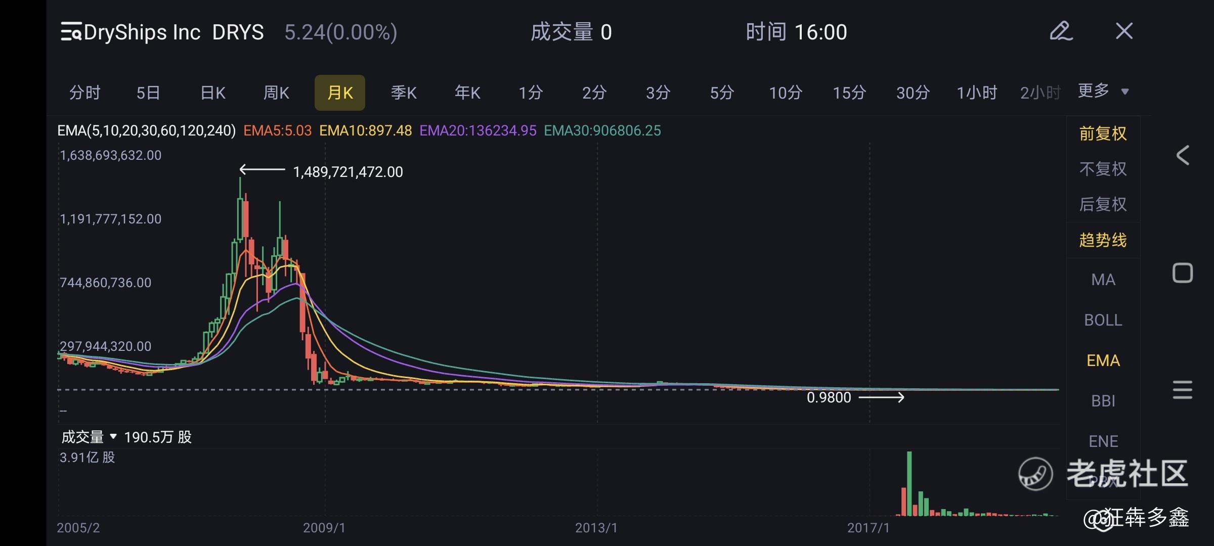 $Faraday Future(FFIE)$ FFIE 总让我想起当年的一只妖股,dry ship inc.(DRYS)。也是上蹿下跳,一周暴涨2100%,一天暴跌80%. 不断的合股、增发、再合股、再增发,最后退市。用前复权来看,最高点时14.9亿美元(你没看错)买一股,拿到最低点时只有0.98美元,退市时5.25美元。