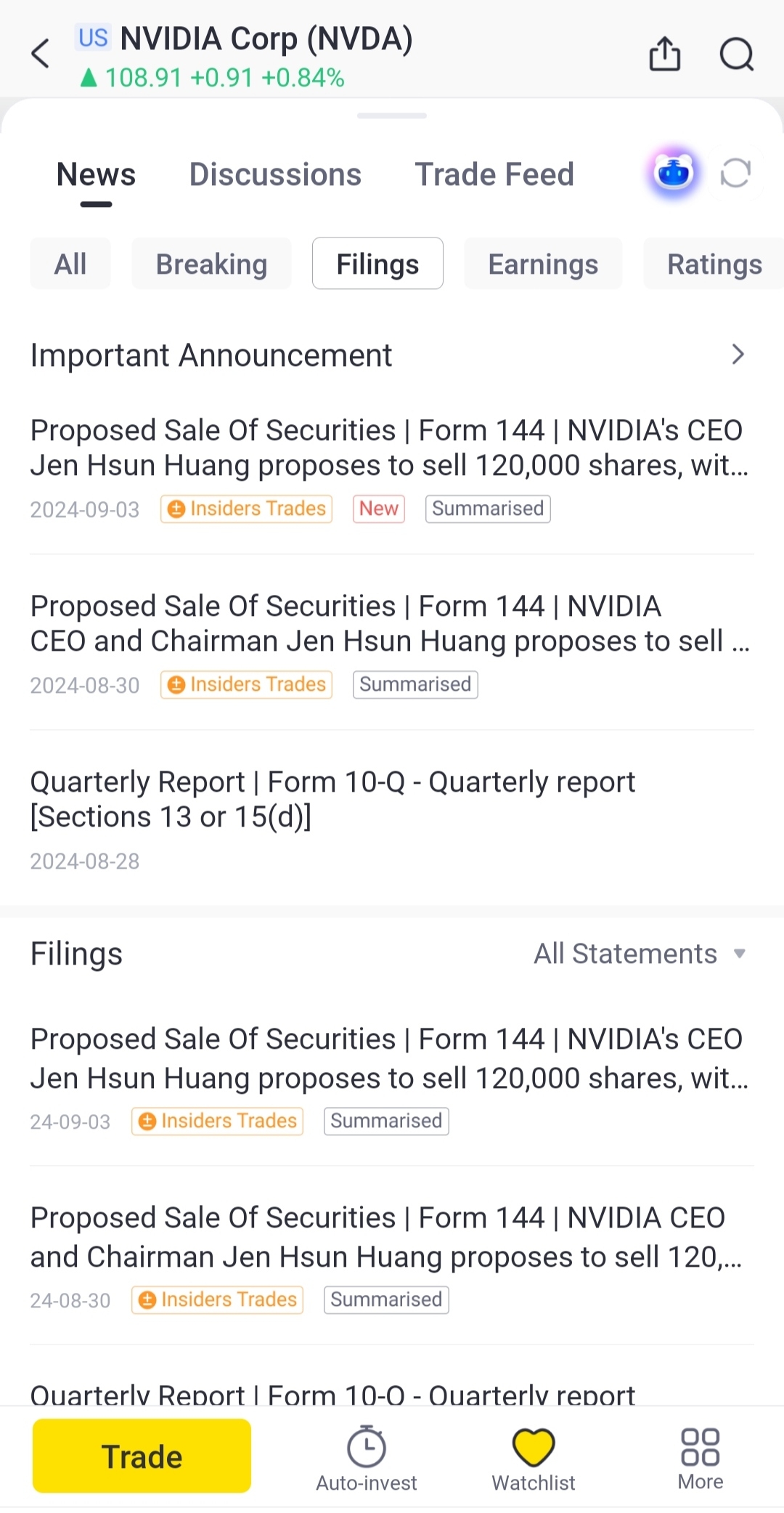 $NVIDIA Corp(NVDA)$ I reviewed the filings section for Nvidia on Tiger Brokers and decided against purchasing, partly based on what I saw there. Additionally, I won't consider buying Nvidia at any price above $50.