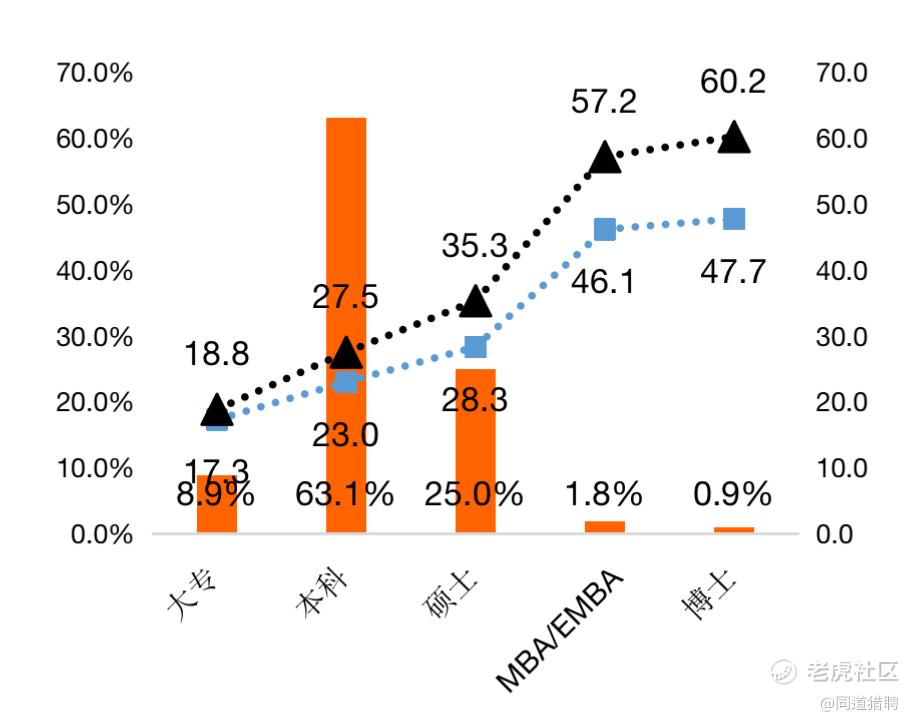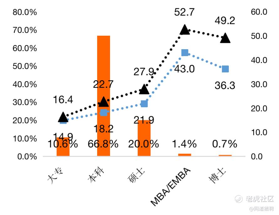 88.1%为本硕学历,其中硕士学历占1/4,MBA/EMBA及博士的薪资显著高于本科及普通硕士;39.8%来自于985/211院校,985院校薪资(30.2万元)显著高于普通院校(22.5万元)。更好的院校更高的学历带来更大的薪资价值。