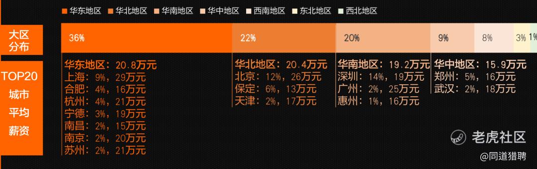 22%的人才聚集在华北,其中12%在北京,其次为保定和天津,北京薪资略低于上海,在华北区域最高。