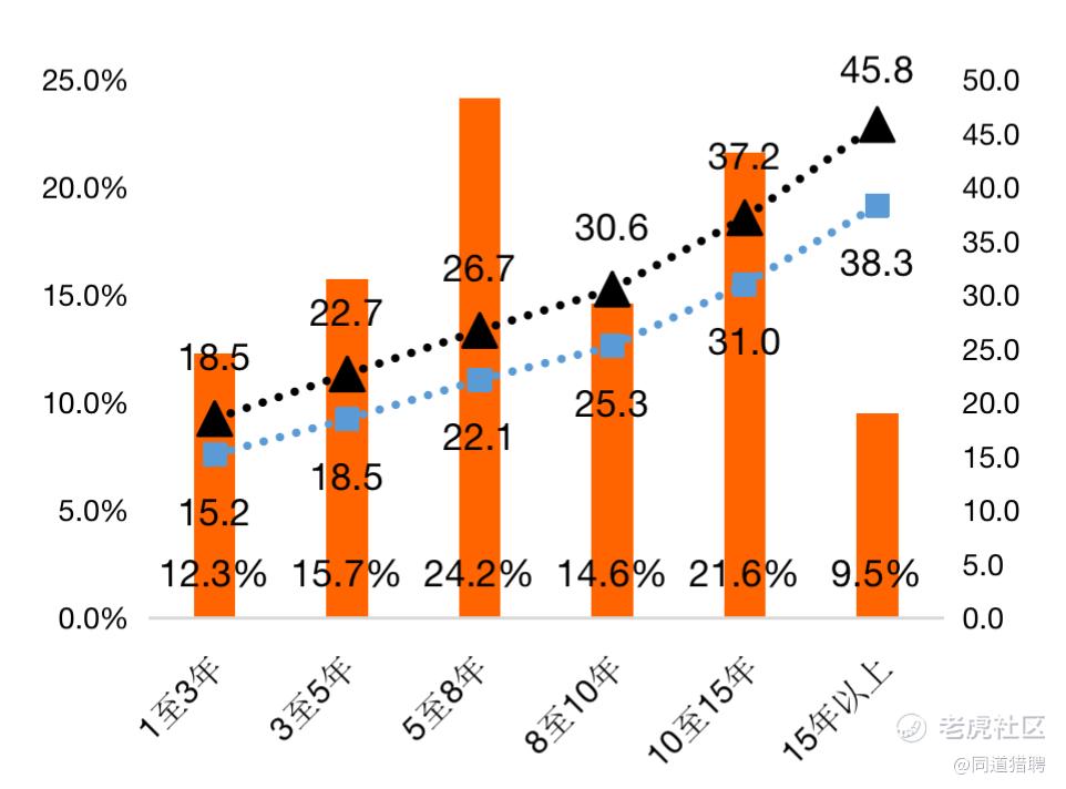 0-15年占比较高,占总人才的6成,薪资随着工龄的增长稳步上升。