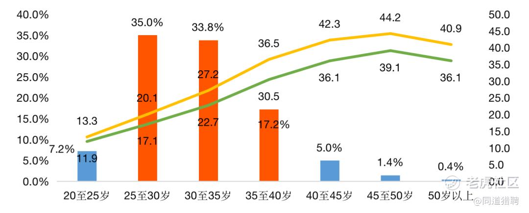25-40岁人才占比最多,占总人才的86%,50岁以上人才薪资下降。