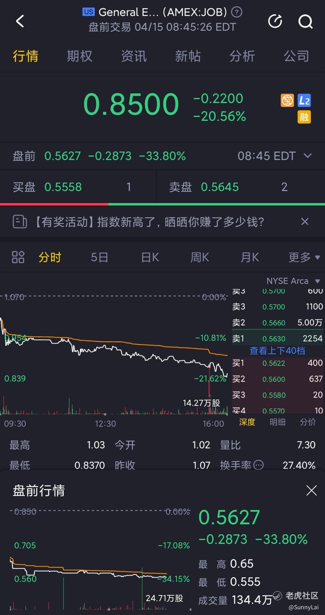 GEE集团是一家127年历史的招聘公司,昨天早盘股价还在1.03元,盘中公布以0.60元增发5000万元股票来还债,引发股价大跌,收盘0.85元,今天盘前更是暴跌至0.5550元。
