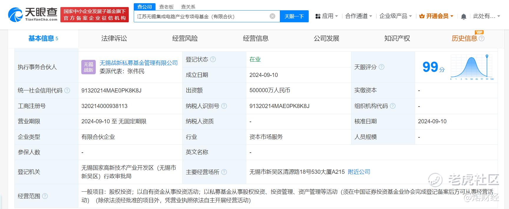 天眼查App显示,近日,江苏无锡集成电路产业专项母基金(有限合伙)成立,执行事务合伙人为无锡战新私募基金管理有限公司,出资额50亿人民币,经营范围含股权投资,以自有资金从事投资活动,以私募基金从事股权投资、投资管理、资产管理等活动。合伙人信息显示,该基金由无锡锡创聚力股权投资合伙企业(有限合伙)、江苏省战略性新兴产业母基金有限公司、无锡产业发展集团有限公司、无锡市创新投资集团有限公司、无锡战新私募基金管理有限公司共同出资。