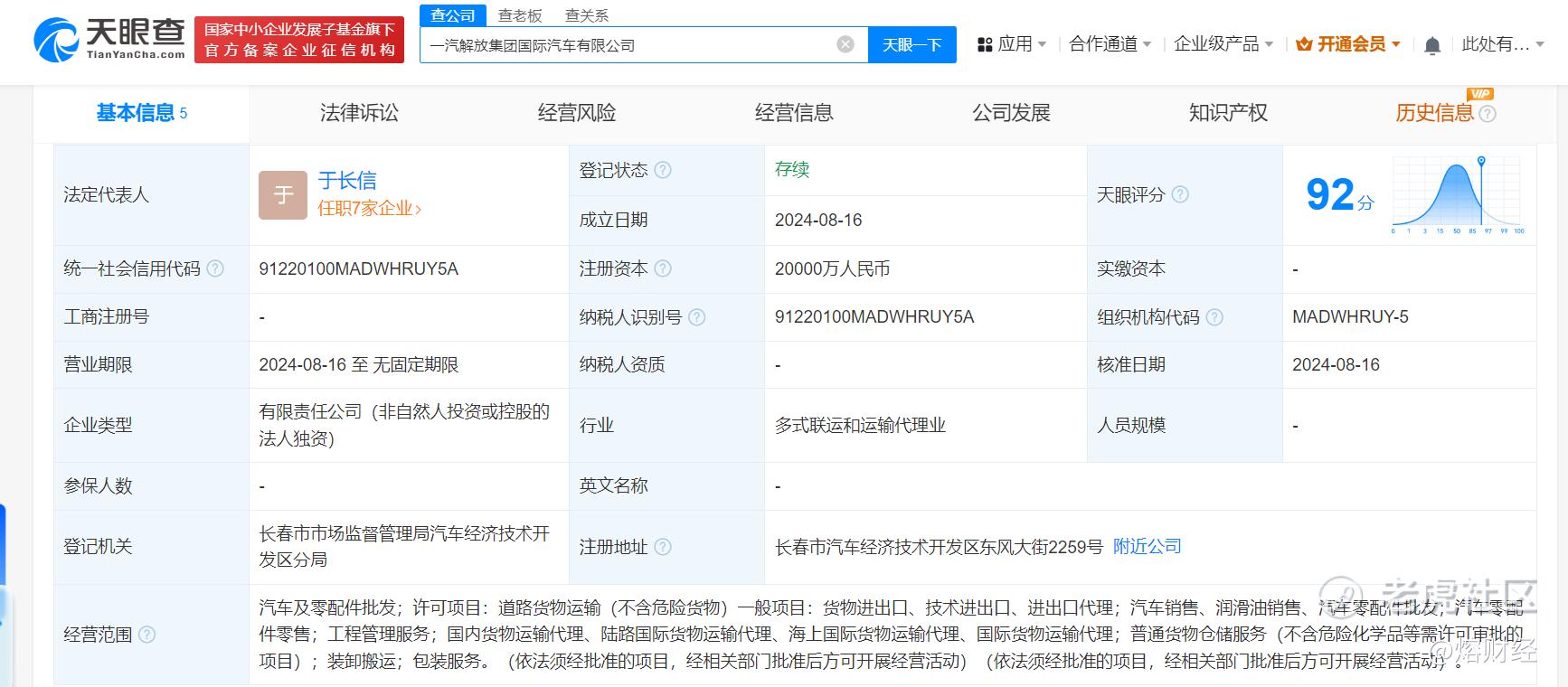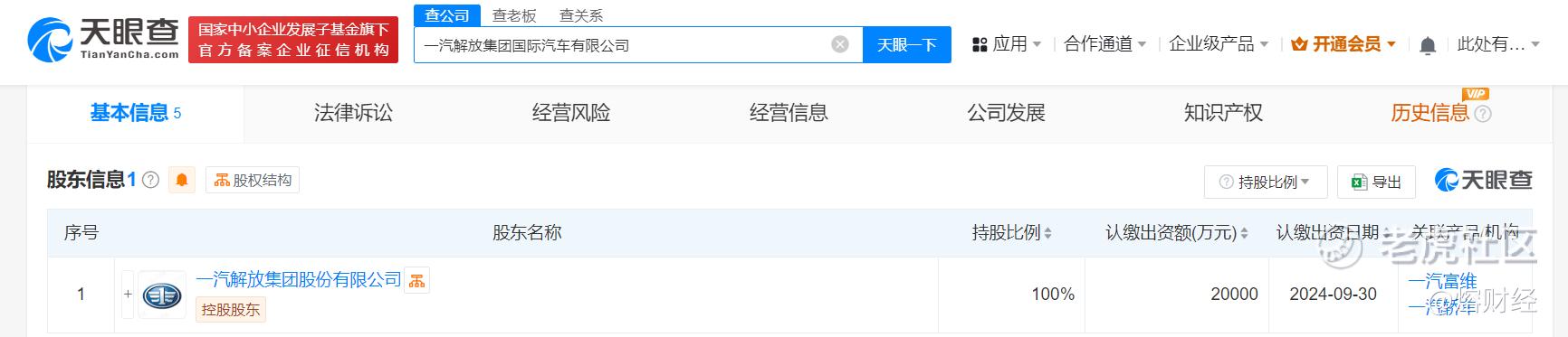 天眼查App显示,近日,一汽解放集团国际汽车有限公司成立,法定代表人为于长信,注册资本2亿人民币,经营范围含汽车及零配件批发,道路货物运输,货物进出口、技术进出口、进出口代理,汽车销售、润滑油销售、汽车零配件批发,汽车零配件零售,工程管理服务等。股东信息显示,该公司由一汽解放全资持股。