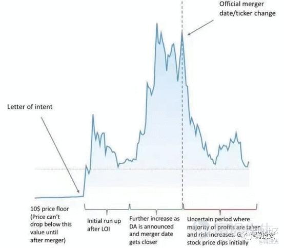 2)阶段二,在媒体报道潜在合并对象后、SPAC向SEC提交意向书前,股价会迎来第一波大涨,随后回调,市场开始等待合并谈判的结果;