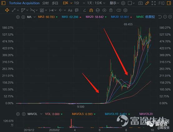 2020年典型SPAC投机案例,电动卡车公司Hyliion(股票代码Shll),图中短箭头是阶段二,长箭头是阶段三(股价大幅超越阶段二高点):