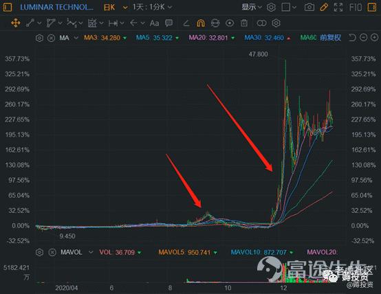 另一个SPAC投机案例激光雷达Luminar,短箭头同样是阶段二,长箭头是阶段三(股价同样突破前高):