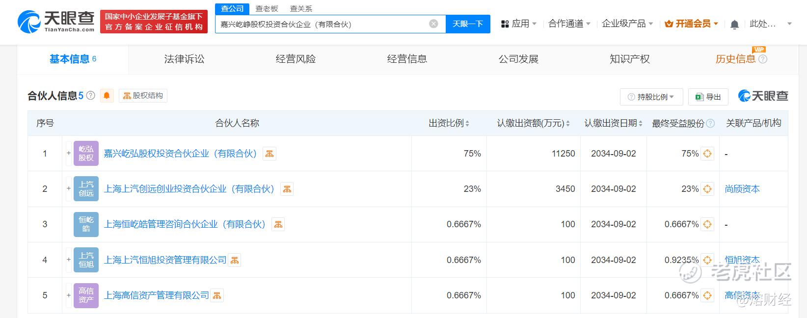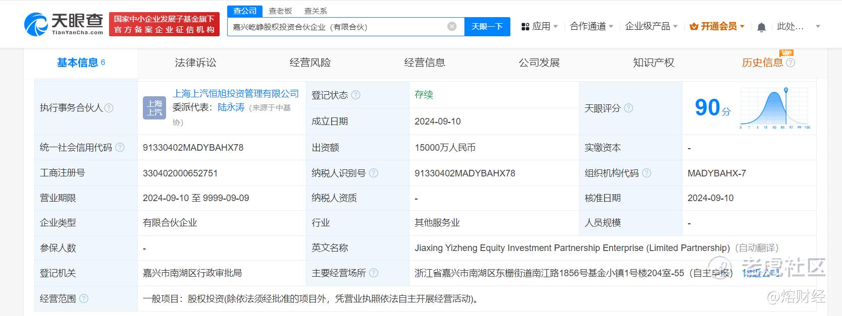 天眼查App显示,近日,嘉兴屹峥股权投资合伙企业(有限合伙)成立,执行事务合伙人为上海上汽恒旭投资管理有限公司,出资额1.5亿人民币,经营范围为股权投资。合伙人信息显示,该企业由上汽旗下上海上汽创远创业投资合伙企业(有限合伙)、嘉兴屹弘股权投资合伙企业(有限合伙)等共同出资,后者由泸州老窖旗下四川璞信产融投资有限责任公司、上汽旗下上海上汽恒旭投资管理有限公司共同出资。