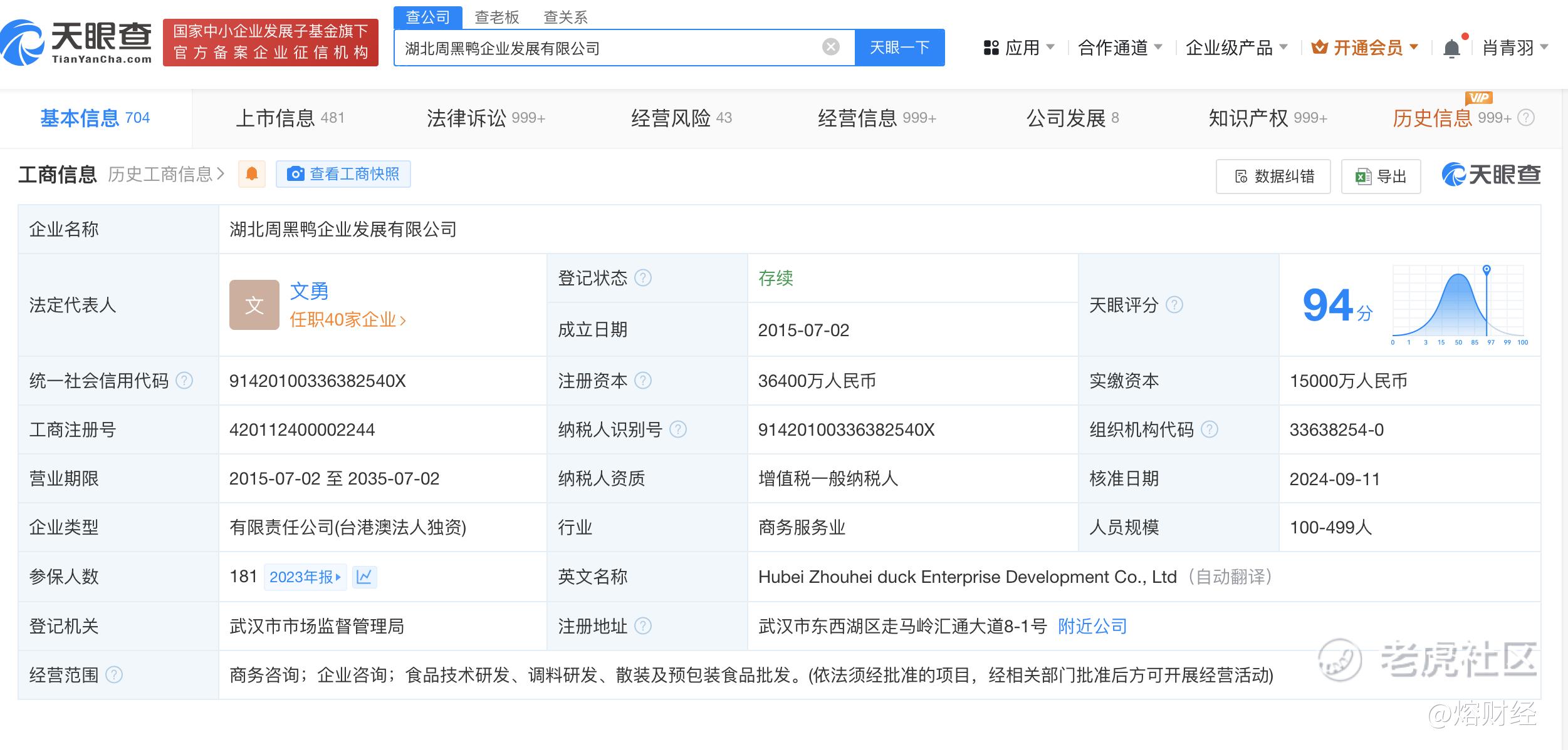 该公司成立于2015年7月,法定代表人为文勇,经营范围含食品技术研发、调料研发、散装及预包装食品批发等。股东信息显示,该公司由周黑鸭控股(香港)有限公司全资持股。