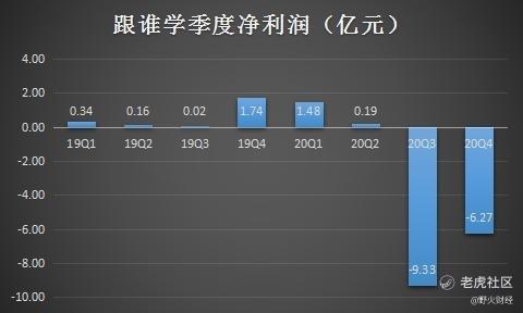 新东方2020财年(截至5月31日止的12个月)总收入为255亿元,增长大约16%;净利润29.48亿元,增长大约74%。跟随学2020年全年收入刚刚71亿元,不到新东方1/3,而且亏损大约14亿元。就在2018-2019年,跟谁学分别盈利2000万元和2.27亿元。