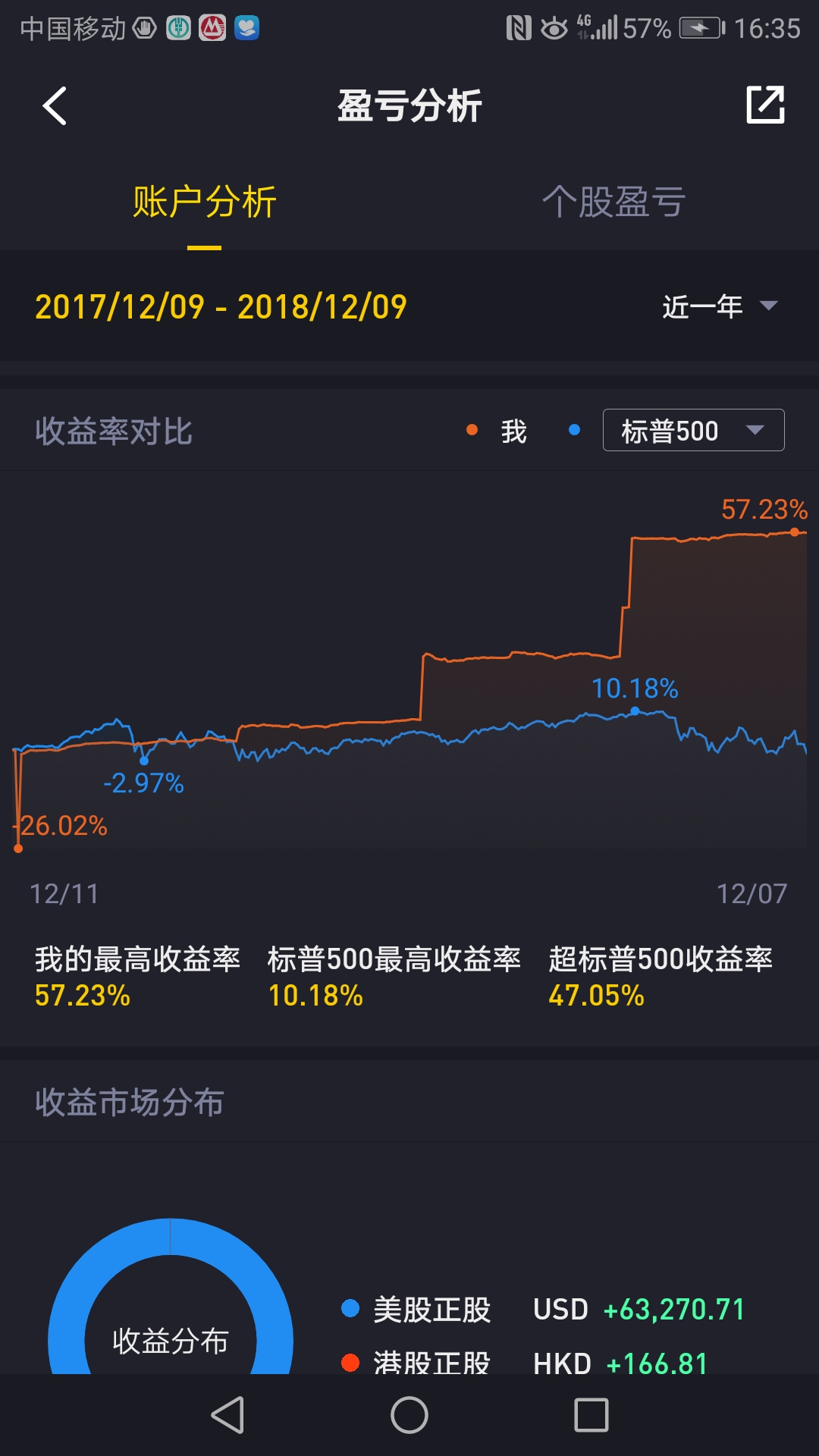 9、最后要自豪地晒一下今年2018年的账户总收益,但是要说明一点,这个图也不怎么准确的,我的零星入金好像也算在收益里面了。有一个亏损-26%,实际根本就没有发生,我也不知道为什么有这个曲线。账户的总收益实际肯定没有57%那么高的,全年盈利大概30%左右,美股正股盈利也没有那么多,本来想涂掉的,后来还是就满足一下自己的虚荣心吧(男人都喜欢吹牛逼的嘛)。最后还是要感谢老虎证券,感谢一年分四次红的美股市场。