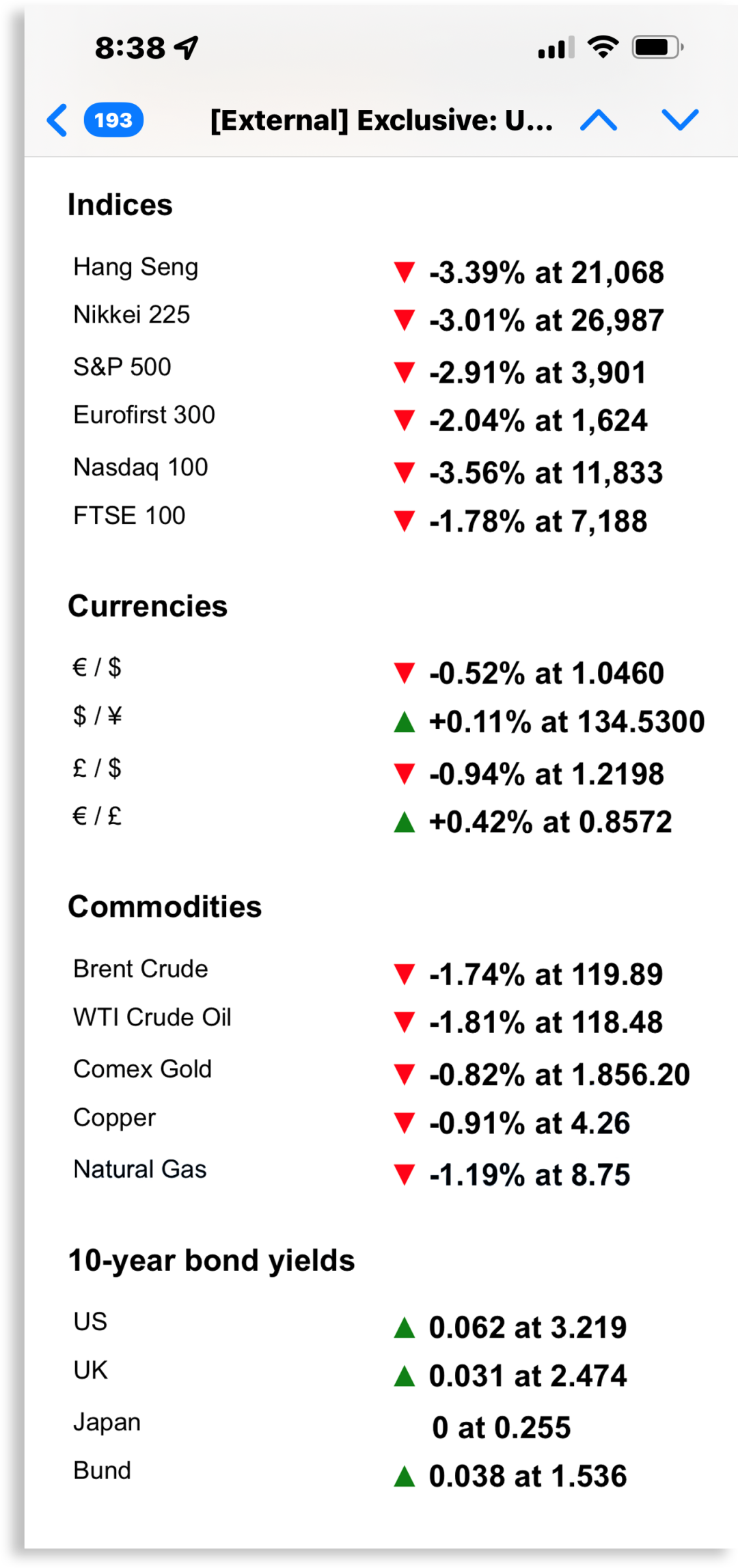 这是市场上艰难的一天:由于美联储和其他央行的行动,利率在上升,于是资产价格因此承受着巨大压力。但是看看这张表。所有国家的股指都大幅下跌。每种货币相对于美元都下跌了。所有大宗商品都在下跌。只有一样事物是上升的:债券收益率……这意味着债券价格也在下跌。就没有一种资产或一个国家的价值那天没下跌的吗?黄金怎么样,人们认为黄金在困难时期应该表现良好?我这里的观点是,在市场大幅波动期间,没有人进行理性分析或做出区分。他们只是把婴儿和洗澡水一起倒掉,主要因为心理摆动。正如那句老话说的,“在危机时刻,所有相关性都到1。”