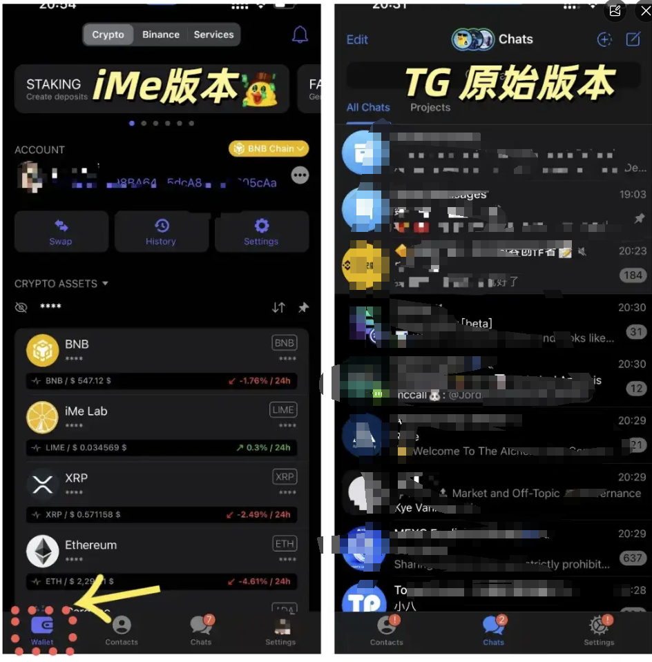 通过图片简要对比可以明显看出,iMe在Telegram原始版的基础上增加了一个额外开发的多链Wallet功能,内置了多链Multichain的资产和相关的Defi,Staking,payment或Binance Pay带来的币安交易服务功能。这使得用户可以很轻松的在TG软件中应用Web3的功能性。(目前已支持BTC, BSC, ETH, SOL,TON, Base, Arb, Matic,TRON, ZKsync,OP, Manta, RON, Celo, Fantom, Blast等18条公链资产)用户可以直接将这些资产发送给iMe TG好友的钱包,并且可以利用不同资产在群组服务中互动。比如通过Cryptobox功能在telegram群组中进行空投与crypto红包的发送。