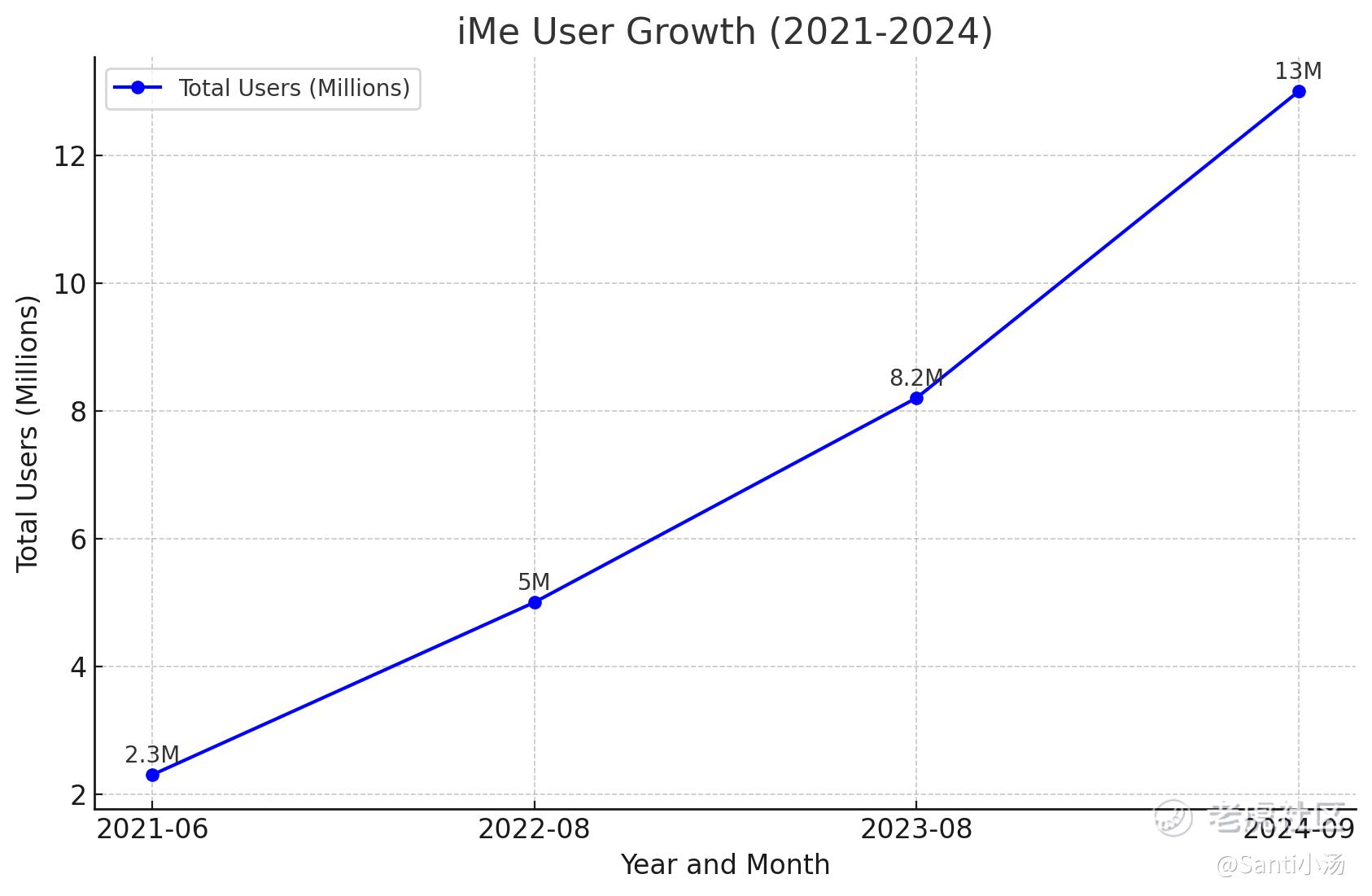 2021年6月,iMe的用户为230万,日活跃用户超过20万,截止2024年9月 目前iME已经拥有1300万的用户。3年用户增长率达到565%左右。由于iME账户和Telegram账户完全通用,TG的9亿用户也可随时无缝的使用iMe版本的TG软件。