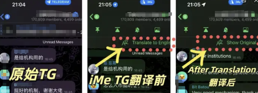 图片2中我们可以看到,目前原始版本的Telegram对话中还不提供即时翻译功能,而iMe版本的telegram中用户已经可以直接使用整个群组对话一键翻译的功能。PC版本也已更新直接一键翻译功能,这对于语言障碍的用户有着非常好的实用性。由此可见,iMe加强版的TG更像是Web3版本的微信生态系统类型