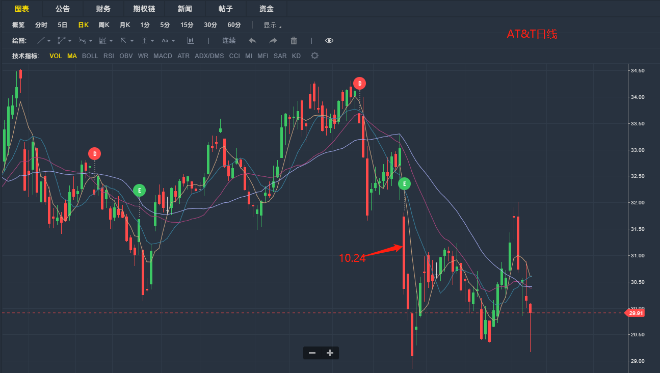 美国电报电话公司在经历一波持续下跌后开始构筑震荡平台,有投资者认为股票已经见底,遂于10月24日进场抄底,买入1万股AT&T股票,而股价就是在当天出现大跌,如今仍在下跌趋势之中。