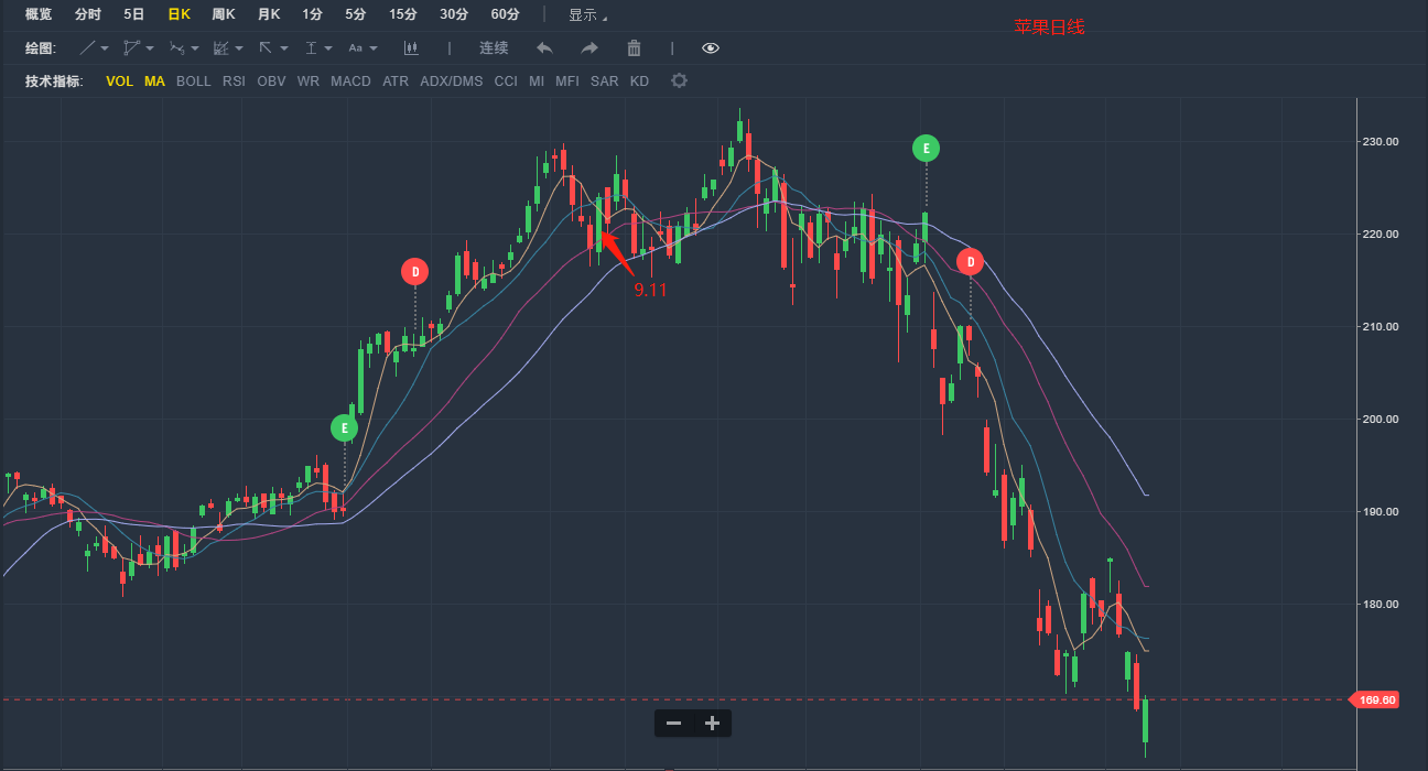 上面这张是苹果 $(AAPL)$ 的日线走势图,经历了一连串的持续大涨后,苹果出现了连续四根阴线的回调,之后收出一根中阳线,于是有投资者大举买入100份(1000股)苹果看涨期权,行权价为145美元,到期日为2020年6月19日,买入时间是9月11日,如图中箭头所指。不久后,苹果的股价创出新高,但很快就是持续大跌,该投资者损失惨重。