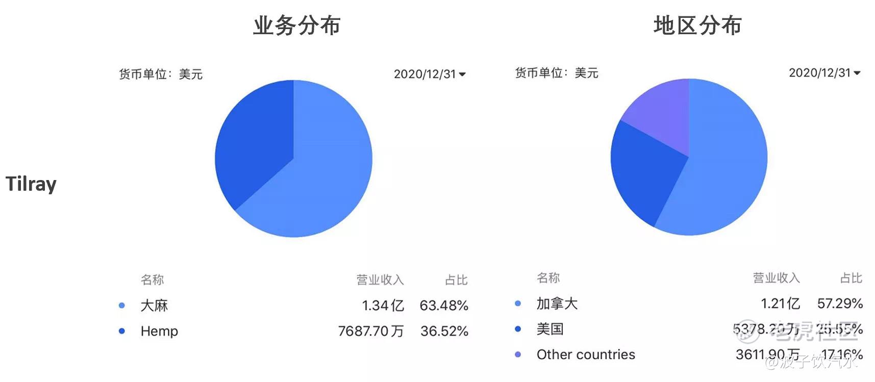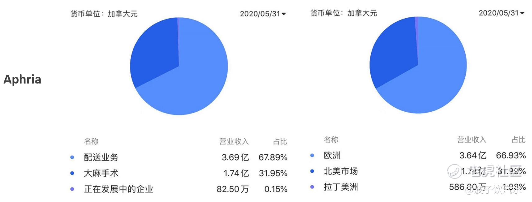 就营收规模来说,Aphria规模最大,约5亿,市场以欧洲为主,北美约三成。Tilray约2亿,加拿大市场占超过五成,另外有1/4的业务在美国。