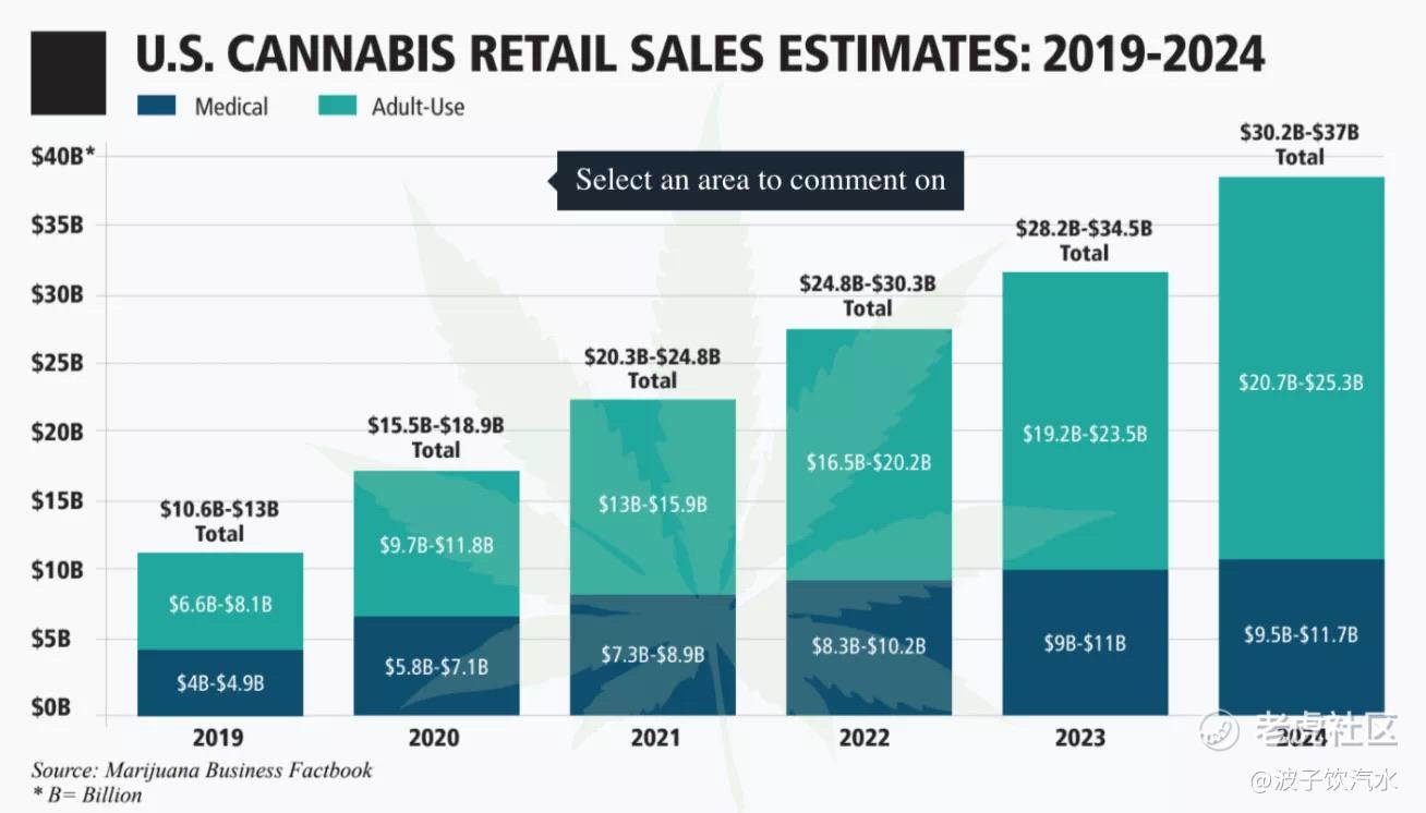 其中,蓝色部分为药用,绿色部分为成人用(包括娱乐性)。可以看到2024年成人用部分预计2021年将达到翻倍。