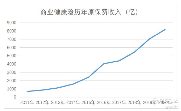 2011-2019年,我国商业健康险的原保费收入从692亿元快速增长到7066亿元,年复合增长率高达34%!对比发展较为稳定的寿险和财险,健康险成为保险领域内增长最为迅猛的细分市场。