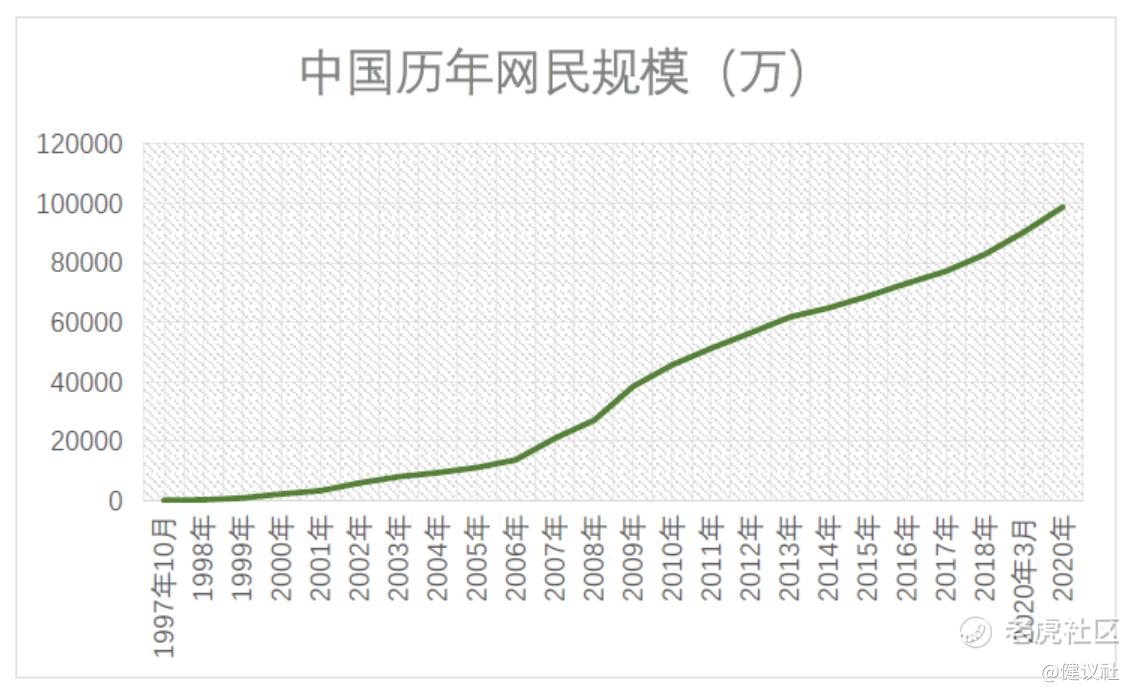 从1997年至今24年,互联网不断释放红利,我国网民数量从62万增长至9.89亿(截至2020年年底)。