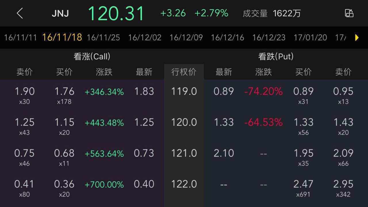 - 后来的几天并不如我预期的那般上涨,一直如躺尸一般,大家都知道希拉里抨击高药价,因此在她当选呼声较高的时候,医药板块会下跌,而强生作为医药股,在此影响下,也跟医药板块一起连续大跌。当时强生的股价跌破了115,我的call更是下跌了60%以上。本来想着希拉里要是当选了,我这张call 也就废了。