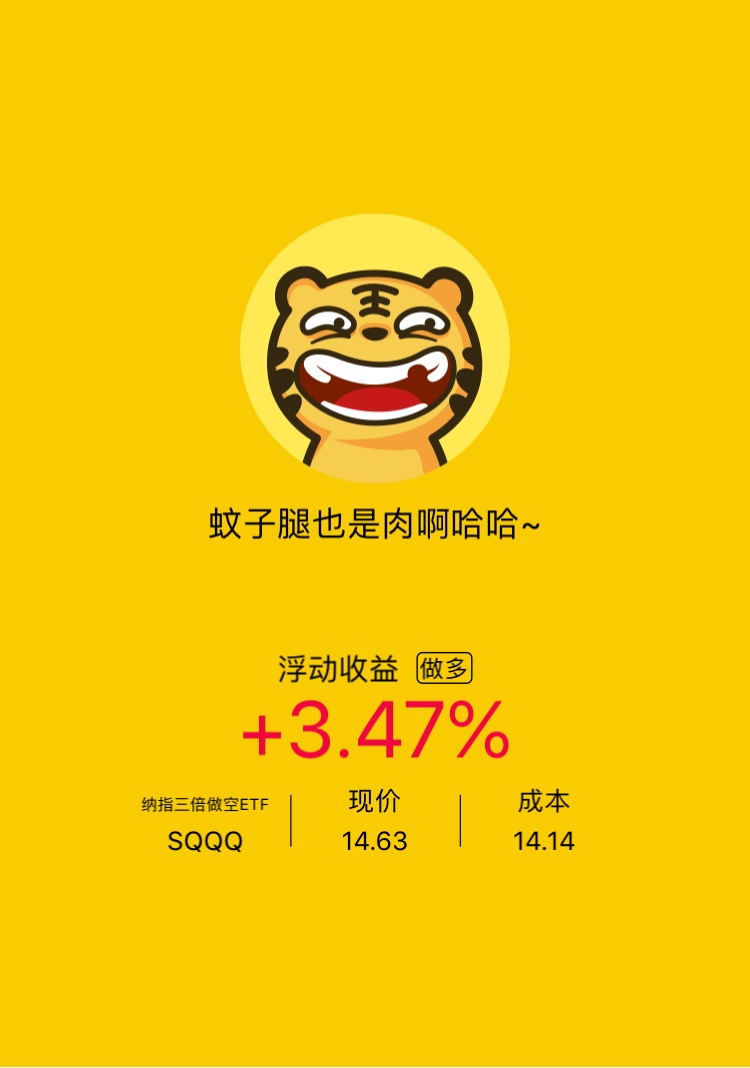 $纳指三倍做空ETF(SQQQ)$ 蚊子腿也是肉呀[捂脸],决定今晚出了。
