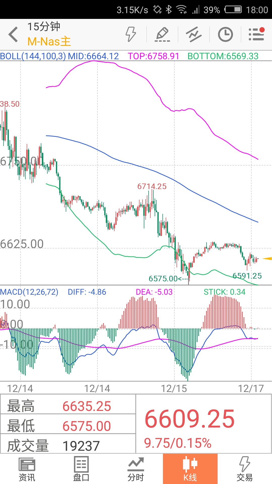 目前运行至15分钟级别c浪弱反弹中,反弹6660-6700区域。中期空单拿好,等待加仓点。