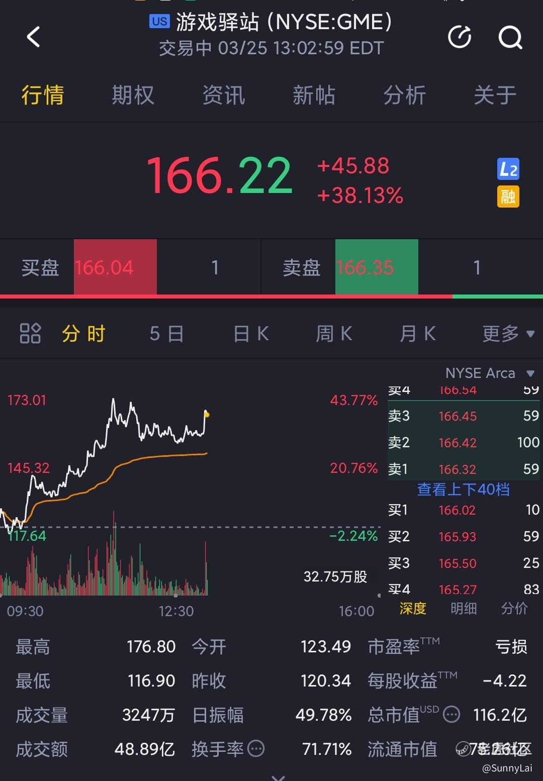 信念!不忘初心,这GME炒的是信仰,连信仰都没有,就别沾这股了。30分钟后,GME不讲理开始暴走,140元、150元、160元、177.49元!从负资产22%到正资产17%,仓没加错!