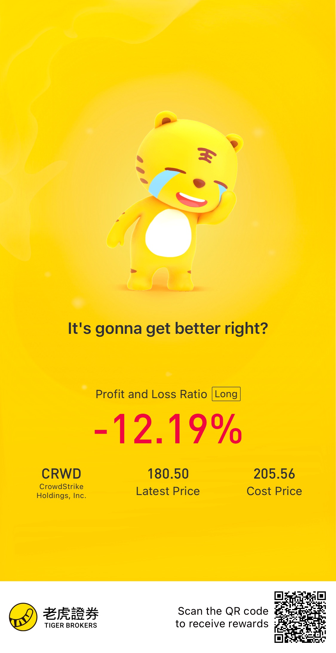 $CrowdStrike Holdings, Inc.(CRWD)$Super cybersecurity company. Valuations still seema tad high at 40+ P/S, but expecting it to turn a profit next quarter and continue bustingrevenue growth targets. Am taking advantage of the dips to accumulate more.