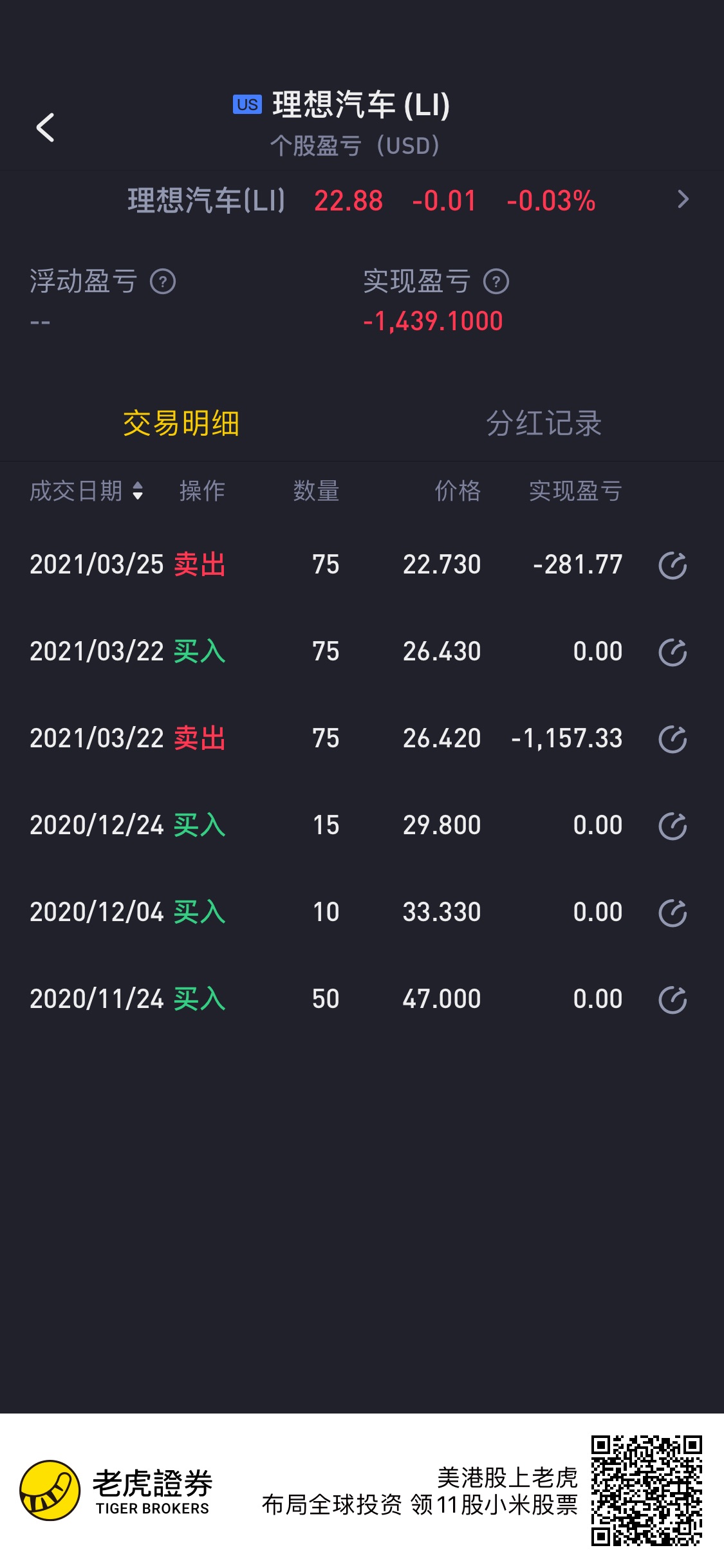 你这啥操作,75股卖出又高1分接回来?22不应该止损的,理想刚上市第一天就到过22,上市到今天业绩是向上的,还增发过,现金流都充沛。完全应该22补仓的,你就吓得卖了。今天还没到上次的20以下呢, 你就着急卖了。