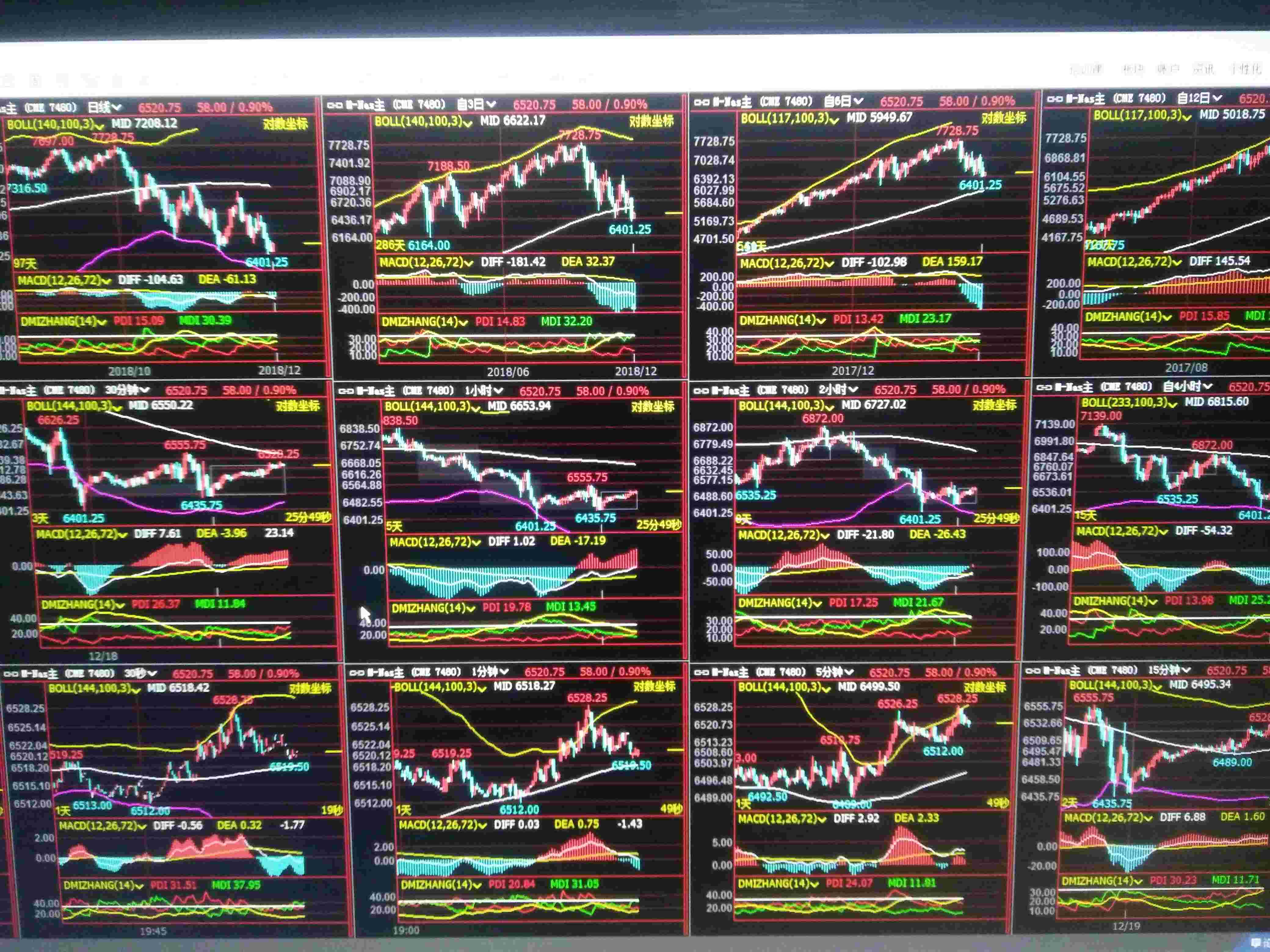 昨天开始纳斯达克期货进入15分钟级别的震荡,。今晚有5分钟级别回踩后还会继续弹。从60分钟macd看,震荡还将持续。目前30分钟级别中轨动线压力为6550区域,预计会穿过,目标为60分钟动线6650区域。