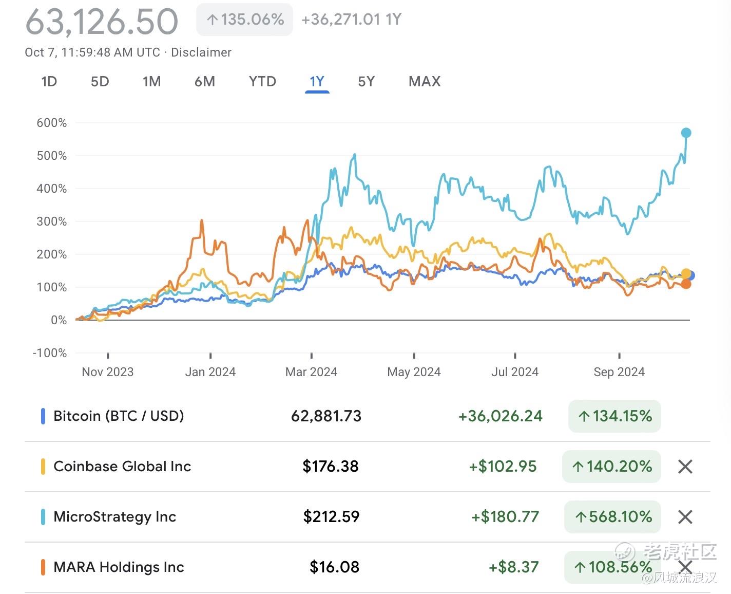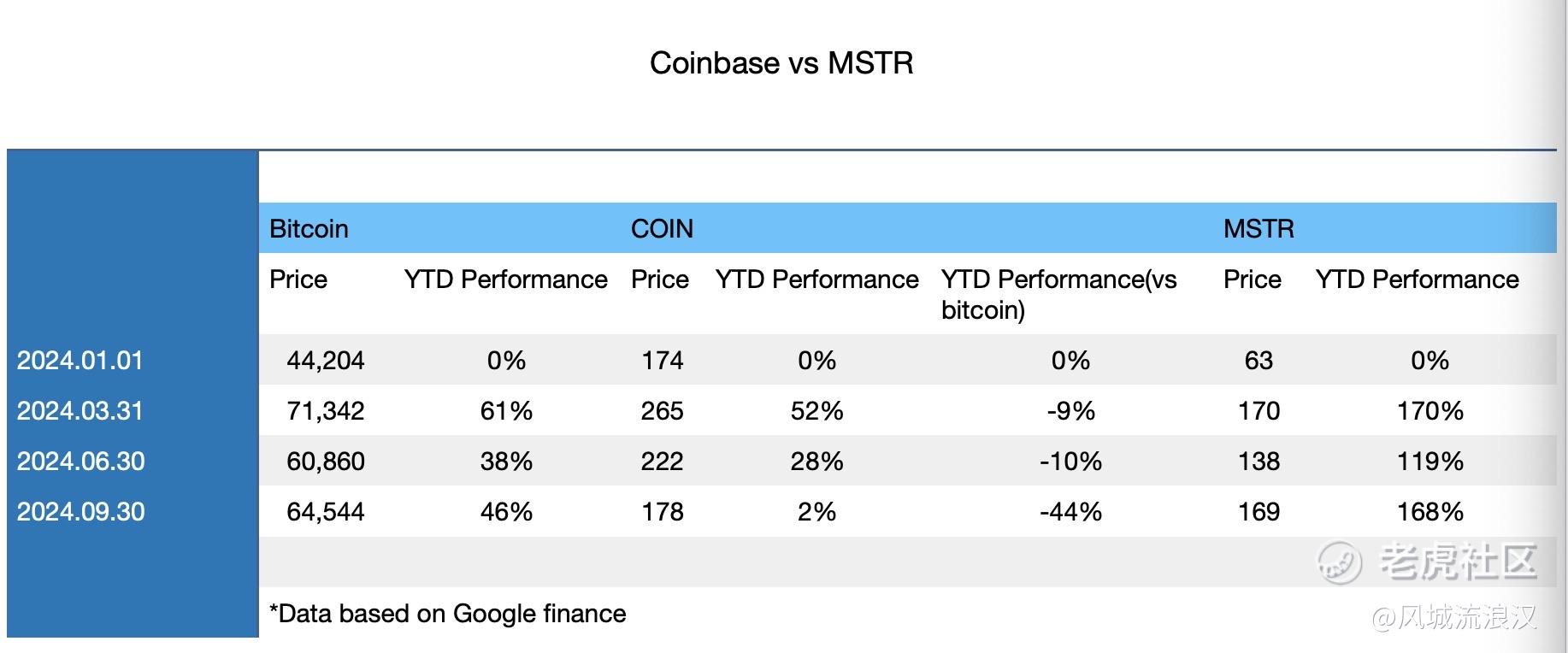基于最近的表现,很多投资朋友都有疑问,为什么coin这么拉。基于年初2024年一月一号至今,到今年九月底,涨幅已经基本被吞。关于表现差可能有若干原因,比如coin主要跟随山寨币,比如潜在竞争对手较多,比如整体交易量下降,而MSTR主要对标bitcoin。这些都是市场尝试给的解释,事实上,资金在第三季度离开coinbase更为明显,包含了很多的内部抛售,币价疲软,市场热点仍在ai等方面因素。因此身边也有朋友果断跳船到了mstr,结果论mstr是币圈概念股的龙一,如果我们拉长近一年的数据,mstr数据超过币本身,超过交易所,也超过矿企。