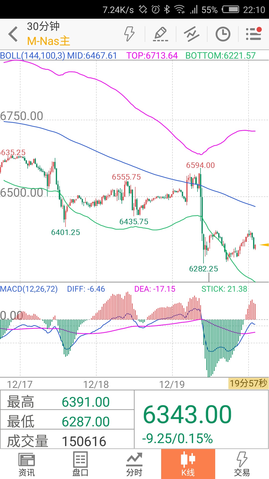 昨天尾盘纳斯达克期货没有触及60分钟中轨动线即开始小跌。使日线级别布林中轨进一步下弯。虽然今天凌晨错过了卖点,不过从30分钟以下级别看还有一次反抽30分钟布林中轨动线6450区域的空方机会。可以继续加空。
