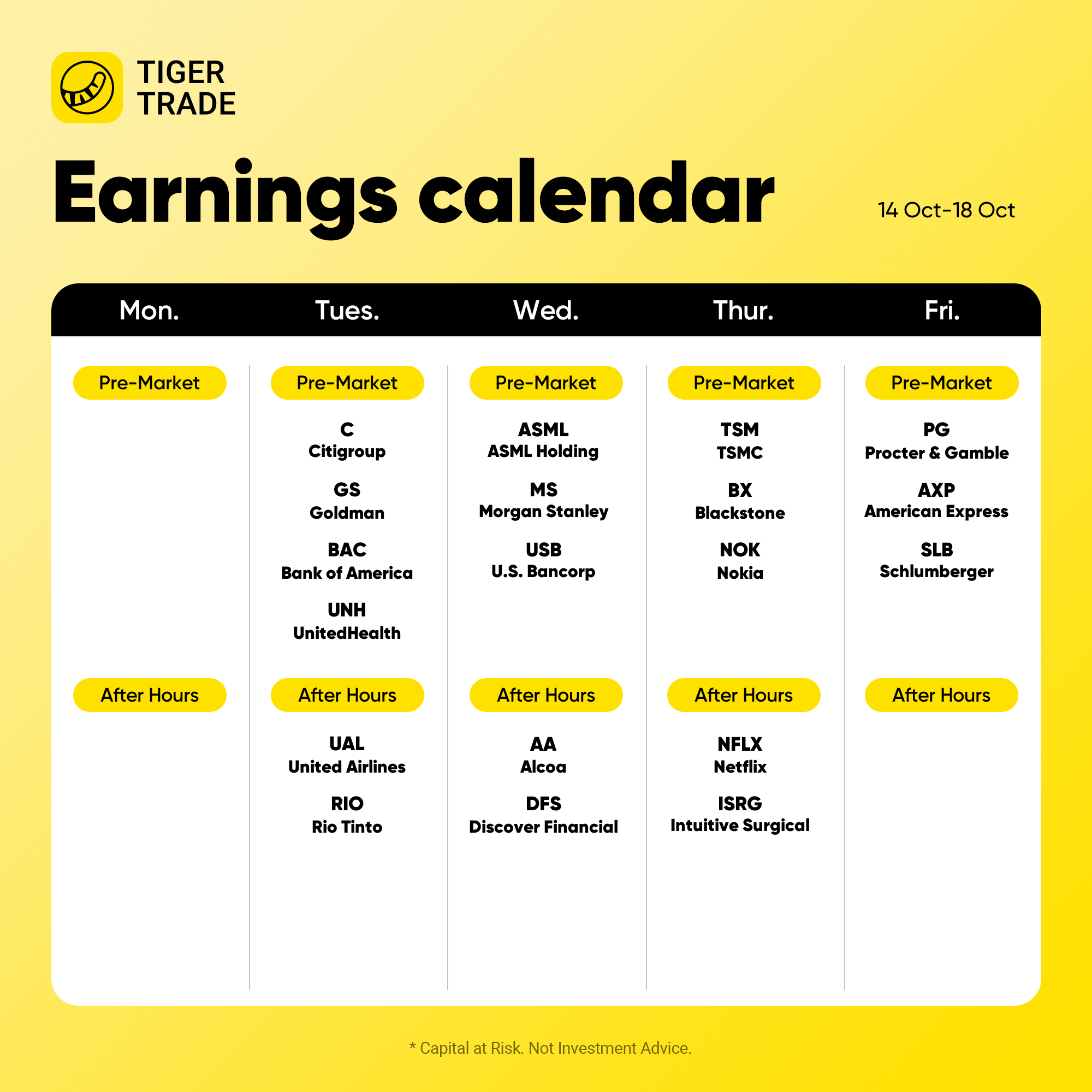 上周摩根大通与富国银行为美企 Q3 财报季揭开序幕,这两家业绩均优于预期。高盛、美国银行及花旗将于本周二公布季报;如果业绩超预期,可关注美国金融行业(银行、保险等)的短线交易机会。