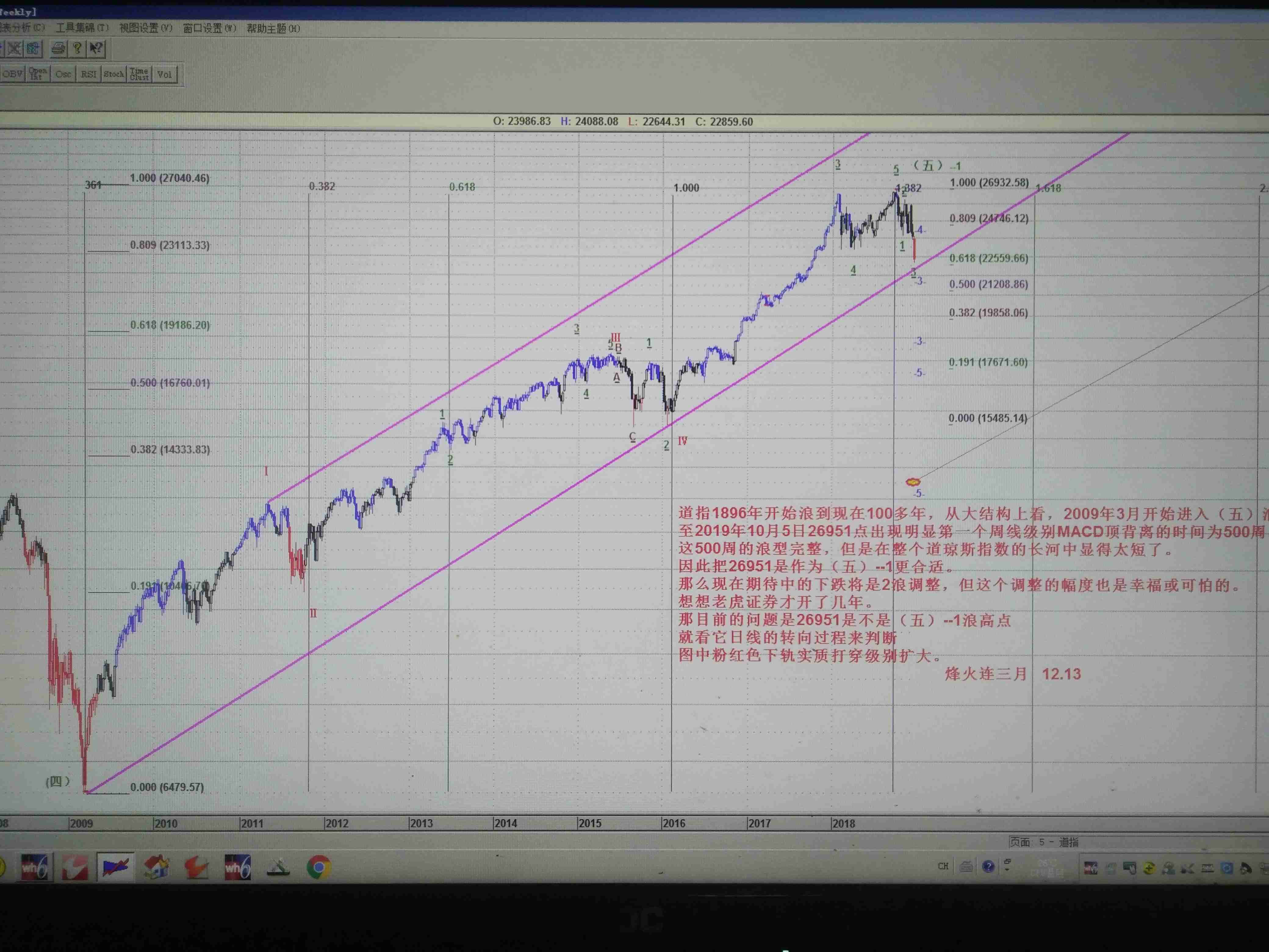 那么现在的关键就是验证是否会进入2浪调或者五浪中的1浪还没有完成。从图中的右上方我已画了2018年12月21日15503点至9月28日26951点的黄金分割,以及粉红色的趋势线。昨天的下跌并没有跌破粉红色支撑线,只打到0.618分位。