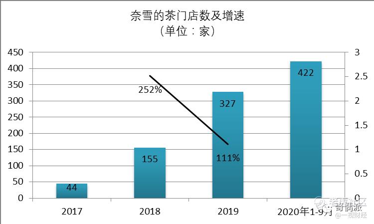 2017年、2018年、2019年及2020年前三季度,奈雪的茶门店数量为44家、155家、327家和422家。截至2021年2月5日,门店总数增至507家。其中2019年及2020年前三季度相比上一报告期门店分别净增172家和95家,2018年、2019年的门店增速为252%、111%,门店增速呈下降趋势。