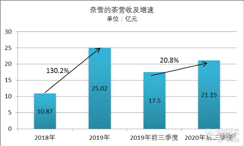 数据显示,2018年及2019年,奈雪包括子品牌在内的营收分别为10.87亿元、25.02亿元;2019年前三季度及2020年前三季度,收入分别为17.5亿元、21.15亿元。2019年和2020年前三季度营收同比增速分别为130.2%和20.8%。2020年前三季度奈雪的茶营收增速大幅度放缓。