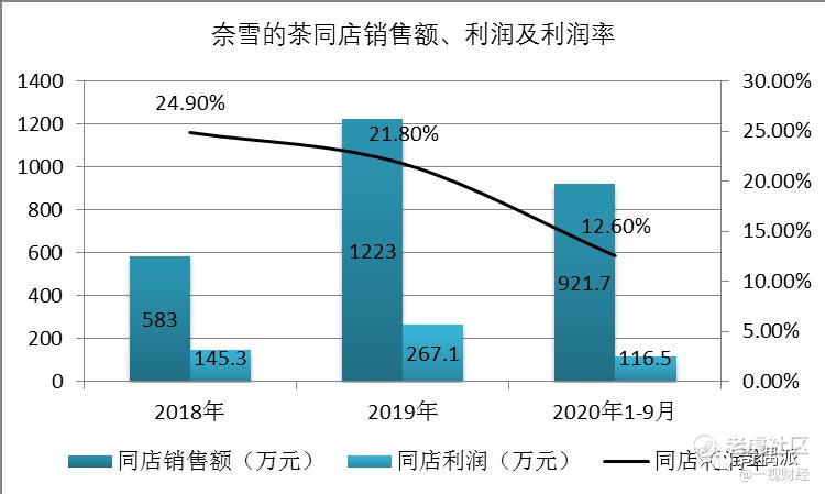 奈雪2018年同店销售额总计583万元,同店利润145.3万元,同店利润率24.9%。到了2019年,奈雪同店销售额总计达到1223万元,同店利润达到267.1万元,但是同店利润率下滑到21.8%。而至2020年前三季度,奈雪同店销售额总计921.7万元,利润116.5万元,同店利润率仅为12.6%。