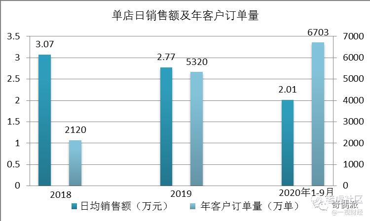 2018年、2019年及2020年前三季度单店日均销售额分别为3.07万元、2.77万元和2.01万元,呈现持续下降趋势,特别是在2020年,公司平均单店销售额出现快速下降。同时,上述对应年份客户订单量分别为2120万、5320万、6703万,同比增速为150%和26%,也在下滑。