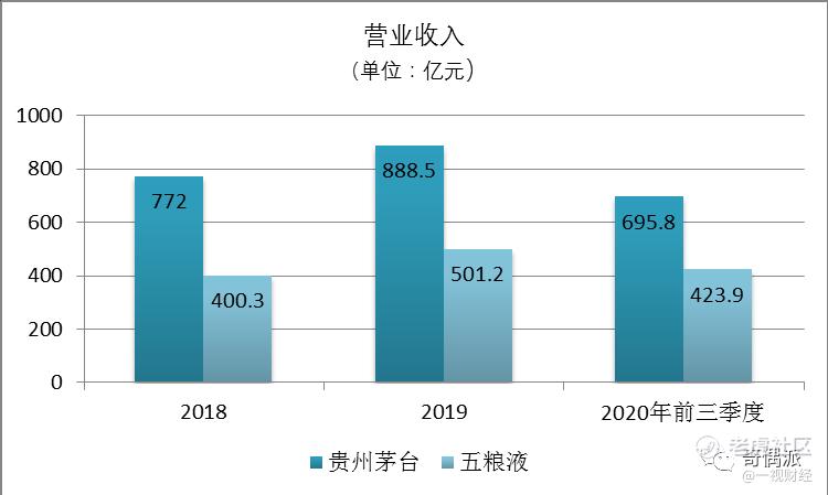 从营收规模上,贵州茅台2018、2019和2020年前三季度的营业收入分别是772亿元、888.5亿元和695.8亿元;而五粮液同期的营业收入则分别是400.3亿元、501.2亿元和423.9亿元,营收规模相差甚远。