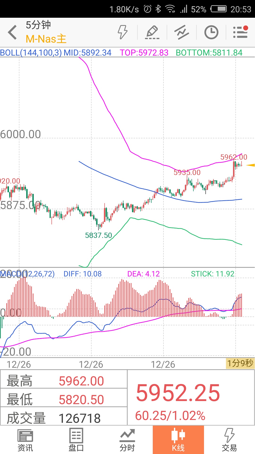 纳斯达克期货今天小分钟级别是由于30分钟级别出现底背离结构后的反弹,目标为15分钟中轨动线5995区域,之后会回踩构筑5分钟级别的平台,波动不会大,多空都难做,我休息了。